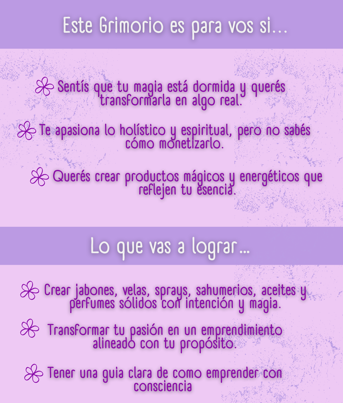 El Grimorio no es solo un curso: es una experiencia energética. Vas a aprender a crear desde la intención, a conectar con la energía de los elementos y a manifestar a través de tus productos. No se trata solo de “hacer cosas lindas”, sino de activar tu magia creadora y alinearte con tu propósito.