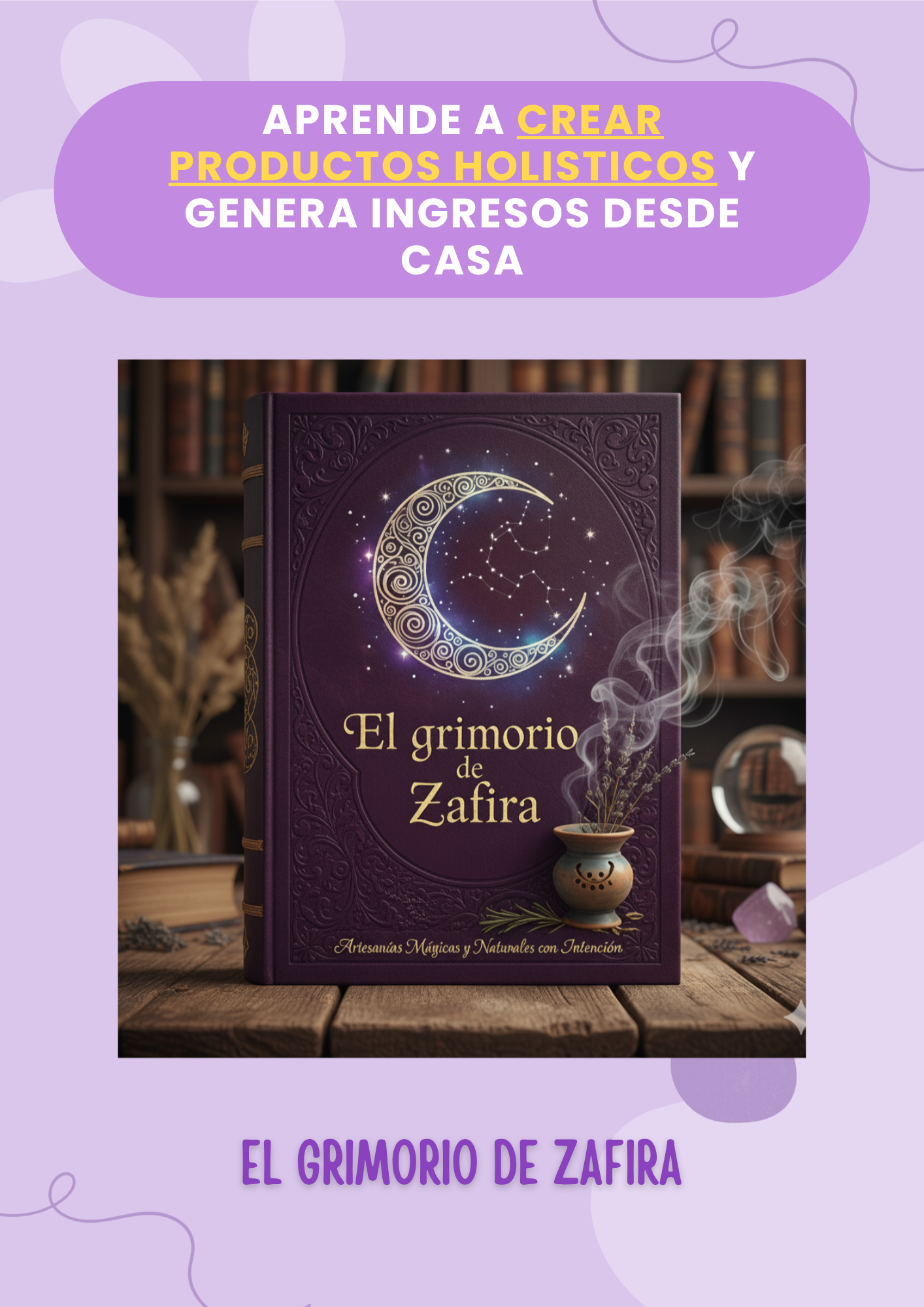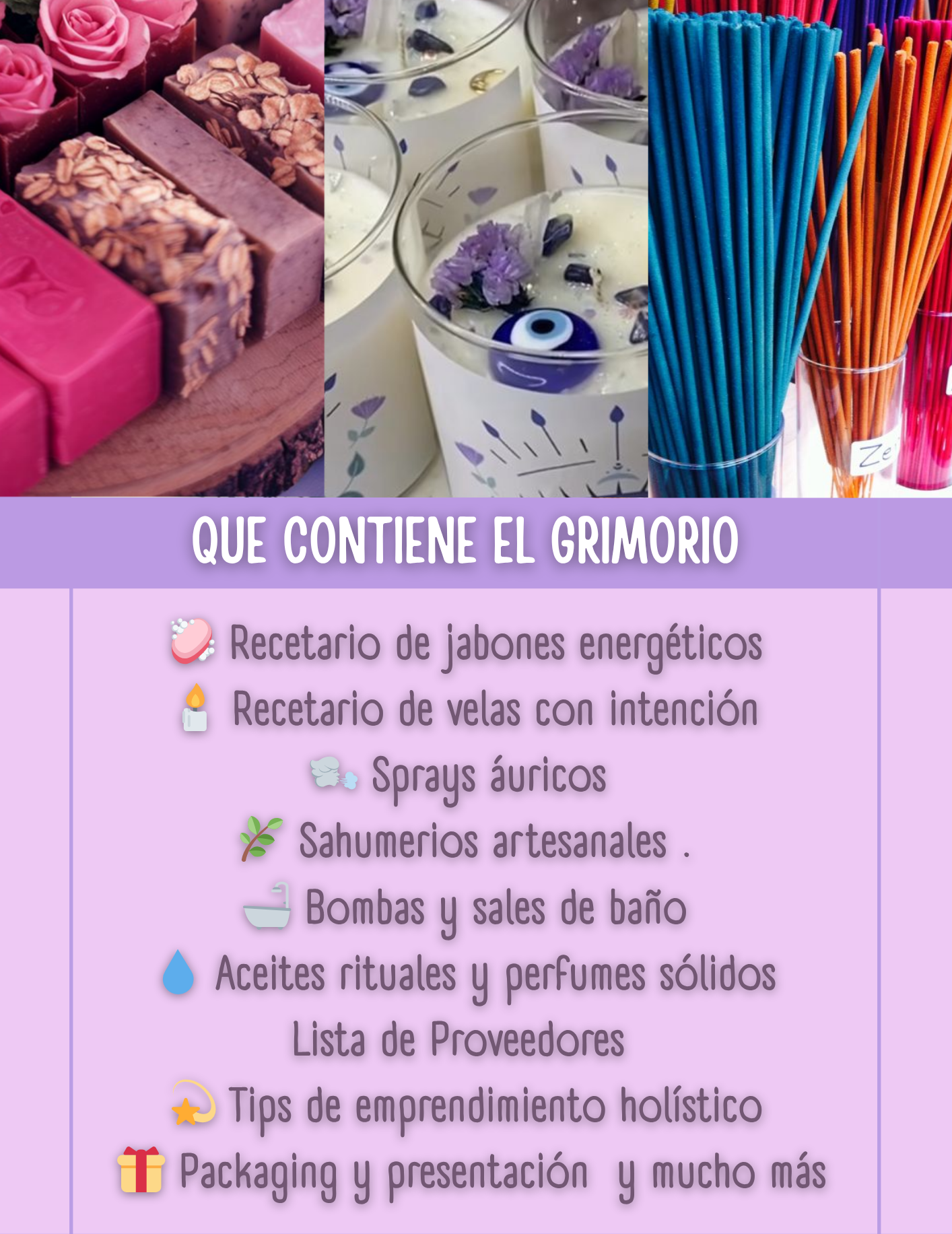 Es una guía completa donde te enseño a crear tus propias artesanías holísticas (velas, jabones, sahumerios, sprays, y más), a entender la energía detrás de cada ingrediente, y a transformar todo eso en un proyecto con propósito.